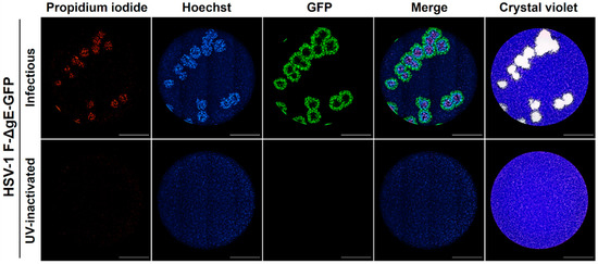 Comparison of DNA fluorescent dyes with a transgenic fluorescent virus for the identification of individual viral plaques by live-cell imaging. Vero cells were inoculated with either infectious or UV-inactivated HSV-1 F-ΔgE-GFP fluorescent virus, cell nuclei were Hoechst stained, and cells were subjected to plaque assay for 120 h with a medium containing the cell death dye propidium iodide. Viral plaques were confirmed by the standard crystal violet staining. Both fluorescent approaches allowed the identification of all plaques present in the samples analyzed. A representative experiment is shown (n = three independent experiments), total magnification of 40X, scale bar = 2000 µm.