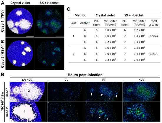 To evaluate the capability of a real-time plaque assay based on the staining of the different stages of viral cytopathic effect for individual plaque recognition and counting, we compared its performance to the standard crystal violet staining. We assessed two cases of viral plaques generated by YFV (case 1) and HSV-1 F (case 2) in Vero cells by those two different approaches upon interpretation by three different analysts (Figure 5A). For both cases, the plaque counts and calculated virus titers were significantly lower for the standard crystal violet staining compared to the plaques counted upon staining with Hoechst and SYTOX Green, due to an underestimation of the number of plaques in areas with plaque overlapping (Figure 5C). A closer view reveals that DNA staining increases the resolution in those areas, as it also allows the visualization of the development of individual plaques in time, enabling the identification of the initial focus of infection before overlapping (Figure 5B).