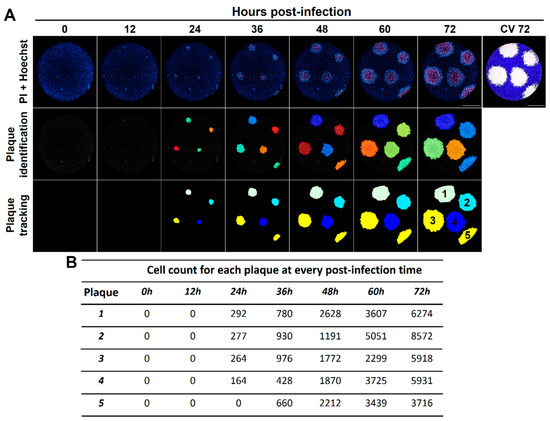 In order to automate the identification of viral plaques and their tracking over time, we analyzed images with our previously published image analysis pipelines developed in CellProfiler (PlaqueIdentification.cpproj and PlaqueTracking.cpproj) [14] obtaining a good time-resolved identification of individual plaques (Figure 6A). In addition, this approach allowed us to calculate the total number of cells composing the individual viral plaques over time (Figure 6B).