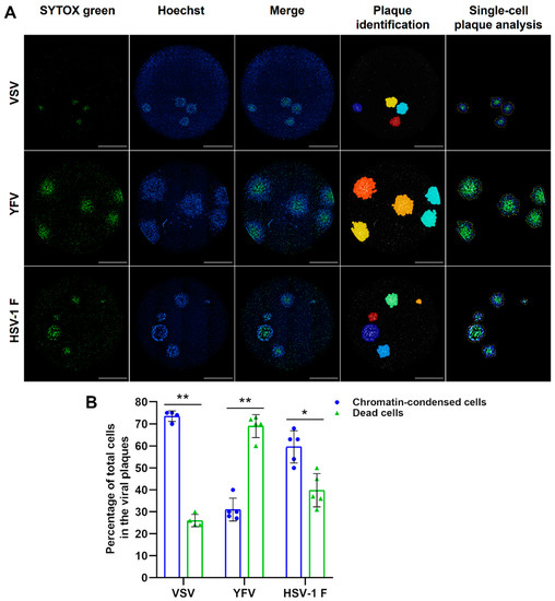Furthermore, we developed a new image analysis pipeline (PlaqueTrackingSX&Hoechst.cpproj) to extract individual plaque information such as the total number of cells with chromatin condensation and plasma membrane permeabilization (death cells) for three animal viruses (VSV, YFV, and HSV-1 F, Figure 7A). With this approach, we noticed that the percentage of those cell subpopulations changes among different virus types (Figure 7B). These findings suggest that the ratio of single cells with a different stage of the viral cytopathic effect within a plaque could be used to differentiate plaque types in viral isolates from mixed infections or to identify mutant clones of the same virus strain. These results indicate that the labeling of viral plaques with DNA fluorescent dyes of differential cell permeability enables a high-resolution real-time plaque assay with the potential to be automated by the use of image analysis software to identify and characterize individual viral plaques.