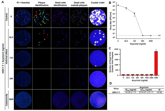 Vero cells were seeded on a µClear black 96-well plate at a density of 25,000 cells/well with MEM supplemented with 10% FBS. After 24 h of incubation at 37 °C with 5% CO2, cells were infected with 10-fold serial dilutions of HSV-1 F. After 2 h of adsorption, cells were labeled with 1 µg/mL Hoechst 33342 for 10 min, washed once with 1X PBS supplemented with 1% FBS and incubated for 96 h at 37 °C-5% CO2 with MEM AutoModTM supplemented with 2% FBS, 1% carboxymethylcellulose, 2.5 µg/mL of propidium iodide, and different rising concentrations of acyclovir (Sigma, 0–3000 ng/mL). Images of the whole well were acquired at 96 h post-infection with a Lionheart™ FX automated microscope and viral plaques were confirmed by crystal violet staining. Automated viral plaques and dead cells counts were performed by image analysis with the software CellProfiler 4.0, using a customized pipeline called “Plaques&CytotoxicityAnalysis.cpproj” (Supplementary Material). The 50% inhibitory concentration (IC50), defined as the concentrations of antiviral required to reduce virus titers by 50%, as well as the 50% cytotoxic concentration (CC50), defined as the concentration of antiviral that reduces cell viability by 50%, were calculated using non-linear regression with the software GraphPad Prism 8.0. (GraphPad Software).