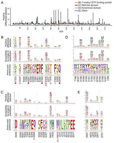 A complete map of pimodivir resistance. (A) Positive site differential selection across the entire PB2 protein. Regions of interest from different domains are underlined in different colors. (B–E) Mutation-level profiles for regions of interest in the (B) 7-methyl GTP binding pocket, (C) mid-link domain, (D) N-terminal domain, (E) other regions of PB2. The top plot of each panel shows the positive differential selection profile, where the height of each amino acid is proportional to its differential selection. The middle plot shows which amino acids are accessible by single-nucleotide substitution from existing avian PB2 sequences. Accessible amino acids are shown in red. The bottom plot shows the amino acid preferences at each site in human A549 cells, as previously measured in [26]. The preference for an amino acid is proportional to its enrichment during the prior functional selection of the complete PB2 mutant library in A549 cells. The height of each letter is proportional to the preference for that amino acid at that site. Sites of known resistance mutations are indicated by either a circle underneath the site or the specific resistance mutation if it is known.