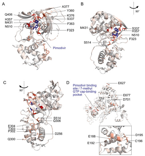 Locations of pimodivir resistance mutations on the PB2 protein. Amino acids are colored on a scale of white to red according to the total positive differential selection at that site, with red corresponding to a high differential selection. Sites of interest, as identified in Figure 1, are labeled. (A–C) Structural model of PB2 cap-mid-link double domain with pimodivir in the transcriptionally inactive “apo” configuration [25]. Sites with resistance mutations that are in the 7-methyl GTP binding pocket and mid-link domain are labeled here. PDB: 6EUV. (D) Structural model of full length PB2 in the apo configuration, but without pimodivir [31]. Sites of resistance mutations that are in the N-terminal domain and elsewhere are labeled here. PDB: 5D98. Supplemental Figure S3 accompanies this figure.