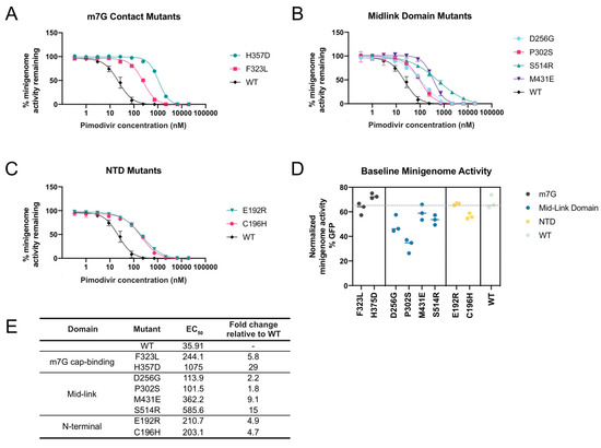 Validation of pimodivir resistance mutations using a minigenome assay. The indicated mutations were all made in the background of PB2-S009 with the E627K human-adaptive mutation. Hence, the “wildtype control”, “WT”, refers to PB2 that already has the E627K mutation. (A–C) Minigenome activity curves were plotted based on minigenome activity at various pimodivir concentrations, normalized to activity in the absence of pimodivir. (D) Minigenome activity was measured for polymerases containing each of the mutations, in the absence of pimodivir. (E) EC50 and fold-change in EC50 relative to wildtype, determined from the fit four-parameter logistic curves.