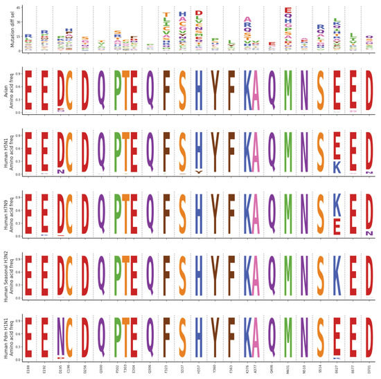 Deep mutational scanning sequence data was analyzed using dms_tools2 (https://jbloomlab.github.io/dms_tools2, v. 2.3.0, accessed on 14 April 2021). The differential selection [30] was quantified as the logarithm of the mutation’s enrichment in the pimodivir-selected mutant virus library relative to the mock-selected control library. Sequencing of wildtype DNA plasmid was used as the error control for calculating differential selection.