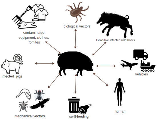 In addition to direct transmission (contact with infected pigs, wild boars, tissue, or a carcass) and spreading through a tick bite, other animals also contribute to ASFV transmission. The unexpected spread of this virus to farms with a high biosecurity level may occur due to the potential transmission of ASFV by flies. Several studies indicate that ASF transmission can occur under experimental conditions after oral intake of fed stable flies (Stomoxys calcitrans) [28]. Recent research performed on Hirudo medicinalis has shown that leeches may serve as a potential reservoir of ASFV in the absence of common hosts (e.g., pigs and ticks of the genus Ornithodorus) [29]. Potential mechanical vectors such as wild or domestic animals that are able to transfer fragments of a carcass or even plant tissues contaminated with the virus should not be neglected. Studies conducted on carcasses of dead wild boar observed three species of predatory mammals and six species of birds to be scavenging on carcasses in different stages of decomposition, including the most common buzzards and ravens. Thus, they confirm the possibility of mechanical transmission of the virus, even over long distances [22].