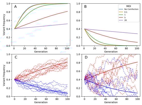 Model simulations showing changes in variant frequencies over viral generations. (A) Frequency changes of a beneficial mutation under the deterministic within-host model, parameterized at different mean cellular multiplicities of infection M. For all simulations shown, the variant’s fitness is and its initial frequency is . (B) Frequency changes of a deleterious mutation under the deterministic within-host model, parameterized at different mean cellular multiplicities of infection M. For all simulations shown, the variant’s fitness is and its initial frequency is . In (A,B), we consider MOI values of 0.1, 1, 5, and 20. Labeled as ‘No coinfection’, we also plot simulations of the model presented in Equation (1), which assumes that fitness is an individual-level property of a viral genome. (C) Frequency changes of a beneficial mutation (red; ) and of a deleterious mutation (blue; ) under the stochastic within-host model, parameterized with a mean cellular MOI of 5. Dashed lines show 10 stochastic realizations under each parameterization. Solid lines show simulations of the deterministic model under the same parameterization. Stochastic simulations used an effective viral population size of . (D) Frequency changes of mutations, as in (C), only using an effective viral population size of .