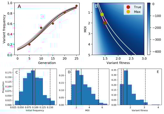 Using the same prior on MOI as with the deterministic analysis and under the assumption that and N are known, we ran the MCMC chain for 50,000 iterations (Figure S8). Posterior distributions for the initial frequency of the variant, mean cellular MOI, and variant fitness are shown in Figure 5B–D. All true parameters fell within the 95% credible intervals of the estimated parameter values. In Figure 5A, we plot 10 reconstructed variant allele frequency trajectories. These results indicate that the stochastic within-host evolution model can be successfully interfaced with longitudinal variant allele frequency data to infer model parameters and underlying variant frequency dynamics using pMCMC.