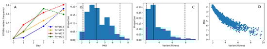 In fitting our model to these data, we first converted days post inoculation to viral generations by assuming an 8 h influenza virus generation time based on []. Replicate samples for this experiment were not available, so we set the degree of measurement noise to 100, but consider the sensitivity of our results to this value (see below). We used an informative prior on the mean cellular MOI, specifically a lognormal prior with a mean of and a standard deviation of 0.4. We used this prior based on studies that indicate that 3–4 virions are generally required to yield progeny virus from an infected cell []. However, we note that a wide range of estimates exist in the literature on the extent of viral complementation required for successful influenza virus progeny production, with findings indicating that this depends on the host cell type and on the viral strain considered [,]. We ran the MCMC chain for 20,000 iterations (Figure S2). Posterior distributions for mean cellular MOI and variant fitness are shown in Figure 3B,C, respectively. The joint density plot of MOI and variant fitness (Figure 3D) indicates that there is a positive correlation between these two parameters, consistent with our findings on simulated data (Figure 2B). Posterior distributions for the initial frequencies of the variant in each ferret are shown in Figure S3.