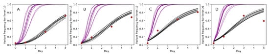 Deterministic model simulations (grey lines) and observed data points (red dots) are shown for (A) ferret 13, (B) ferret 15, (C) ferret 17, and (D) ferret 21. Only days 0, 1, and 3 were used in model fitting. Parameters for the model simulations were drawn from the posterior distributions of the parameters. Purple lines show model simulations under the same parameterizations of variant fitness and initial variant frequencies as the grey lines, but simulated in the absence of cellular coinfection. These no-coinfection projections were simulated using Equation (1).