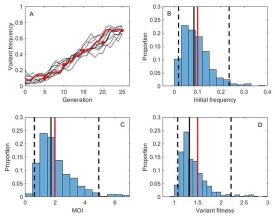 Variant fitness estimation under the assumption of stochastic evolutionary dynamics. (A) Mock data (red dots) generated from a forward simulation of the stochastic within-host evolution model with added measurement noise. The underlying stochastic dynamics are shown with a red line. The model is parameterized with variant fitness of , a mean cellular MOI of , an initial frequency of the variant of . Measurement (observation) noise is set to . The viral effective population size is set to . Grey lines show the dynamics of 10 reconstructed allele frequency trajectories. These trajectories are unobserved state variables that have been reconstructed using pMCMC. (B) Posterior distribution for the initial frequency of the variant. (C) Posterior distribution for the mean cellular multiplicity of infection M. (D) Posterior distribution for variant fitness. In (B–D), black solid lines show the median values of the posterior densities, black dashed lines show the 95% credible intervals, and red solid lines show the true values. 200 particles were used in the pMCMC.