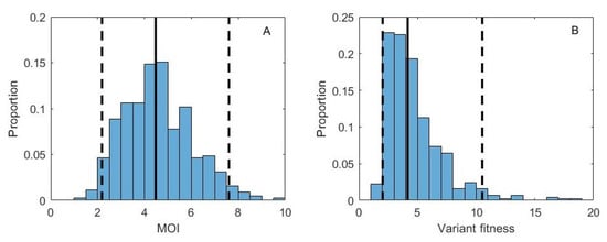 Defining the number of target cells as C, the mean cellular multiplicity of infection is given by N/C, the mean cellular MOI of variant virus is given by , and the mean cellular MOI of the wild-type virus is given by . Under the same assumption as before that viral genomes enter cells independently of one another, we stochastically determine the distribution of variant viruses across target cells using a multinomial distribution with the event probability of being in a cell given by 1/C (for all C cells) and the number of trials given by the variant population size . We similarly stochastically determine the distribution of wild-type viruses across target cells using a multinomial distribution with the event probability of being in a cell given by (for all C cells) and the number of trials given by the wild-type viral population size . The mean fitness of a viral variant in the context of cellular coinfection can then be calculated in a manner similar to the one specified in Equation (4). With as the fitness of a viral genome present in cell i with variant viral genomes and wild-type viral genomes, the mean fitness of a viral variant is obtained by considering the stochastically realized viral content in each cell: