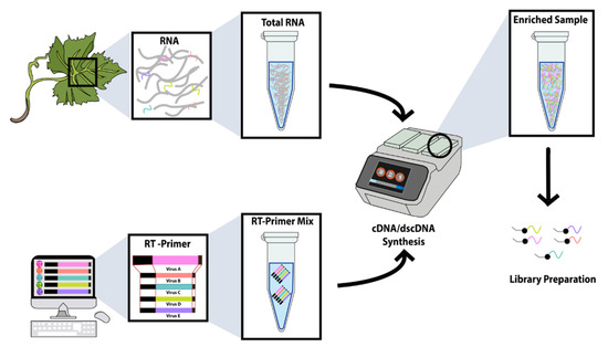 TASPERT method layout showing the sample RNA extraction from infected tissue (top left), the RT-primer design (bottom left), and the virus-specific ds-cDNA synthesis (right). Short colored strands in the RNA extraction section represent viral RNA from different plant viruses, while longer gray strands represent host RNA. FAP are colored black at the 5′ of the RT-primers, and the virus-specific segments are represented with different colors. A degenerate nucleotide representing (A/C/G) is also represented in black at the 3′-terminus of the RT-primers. Only the virus sequences are enriched during ds-cDNA synthesis using the TASPERT RT-primers (center-right). The final TASPERT product is ready for library preparation and sequencing with any HTS platform.