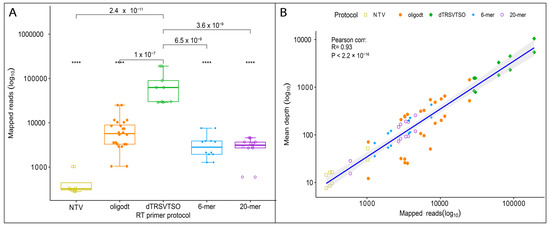 Comparison of libraries generated with TASPERT, OligodT, random 6-mer, and 20-mer RT-primers. (A) Number of reads mapped to the TRSV reference genome showing the highest pathogen abundance in the metagenome was achieved using the dTRSVTSO RT-primers. (B) Correlation between mapped reads and mean depth for TRSV showing dTRSVTSO primers allowed a larger number of mapped reads and deeper exploration during HTS of the sample. A group of non-target virus (NTV) acting as negative control was included. These NTVs did not contain TRSV but grapevine red blotch virus (GRBV). Statistical value meanings in the figure are: ****: p ≤ 0.0001.