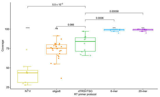 Comparison of reads mapped to the TRSV genome after HTS of libraries generated with the TASPERT, OligodT, random 6-mer, and 20-mer RT primers. NTV is the reference negative control. Statistical value meanings in the figure are: ns: not significant, ****: p ≤ 0.0001 and ***: p ≤ 0.001.