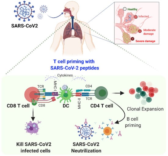 As we know, the adaptive immune response against any viral infection is the key to disease severity; T cells especially are central players in the immune response to viral infection. An enhanced understanding of human T cell-mediated immunity in COVID-19 is vital for optimizing therapeutic and vaccine strategies. The immune system, i.e., the innate and acquired immune response, is activated by SARS-CoV-2 infection. Several studies evaluating the clinical features of SARS-CoV-2-infected patients have reported an incubation time of 4–7 days before the onset of symptoms and an additional 7–10 days before the development of severe COVID-19 [26]. After SARS-CoV-2 entry into the host, a virus attaches to cells expressing ACE2, which facilitates its replication. The viral peptides present through major histocompatibility complex (MHC) class I proteins expressed by antigen-presenting cells (APC) such as dendritic cells (DC) to the cytotoxic CD8+ T cells [27].
