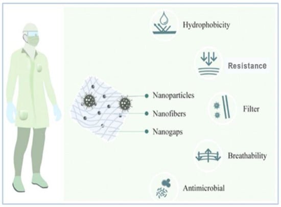 One of the major reasons for widespread COVID-19 infection is person-to-person contact and the respiratory droplets of the infected person. The healthcare professionals need to use appropriate PPE kits, masks, and gloves to protect themselves from the infection. In such difficult circumstances, nanomaterials prove to be an efficient aid for biological and chemical protection. Nano-engineered facemasks, gloves, and PPE kits provide comfortable, hydrophobic, and antimicrobial activity without altering the texture of a fabric (Figure 2) [36]. PPE kits work as an effective barrier against airborne droplets. The use of nanomaterials with textile fibers can provide antimicrobial properties in textile. For example, nano-silver (AgNPs)-impregnated fabrics have already demonstrated antimicrobial properties. AgNPs-based face masks, smocks, lab coats, hospital curtains, etc. have proved to be highly antimicrobial. In this context, the controlled release of nanoparticles for a longer time can serve in modulating the antiviral properties of the fabric [31].