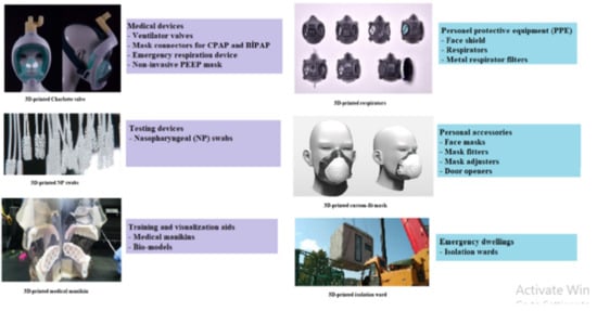 3D printing, also known as additive manufacturing or rapid prototyping, is basically a production technology that utilizes materials such as plastic or metal stacked in 3D layers to create 3D products. 3D printing is mostly used in the field of engineering. It is also used extensively in the healthcare industry. 3D printed face masks, PPE kits, face shields, auxiliary accessories, door openers, and pushbuttons have been designed and offer great opportunities. However, there are several challenges in 3D printing that have to be answered through future research and technology [43,44]. Coronavirus infection can be divided into three stages: asymptomatic incubation period and severe and non-severe symptomatic period. When the defense system of the patient is unable to fight infection, disruption of the tissues occurs, affecting the kidney and intestine and causing inflammation in lungs. 3D printing technology could be used for the production of simple, inexpensive, and structured drug delivery systems using poly (acrylic acid), cellulose acetate, and polyvinyl alcohol (PVA) to prevent infection [43]. Nanomedicines are the future approach in the cure of infectious diseases. The use of metallic nanoparticles, dendrimers, polymer and lipid nanoparticles, quantum dots, and carbon nanotubes have been researched for their applications in nanomedicine. Designing and developing nanomedicines by using 3D print technology will help to satisfy the personal necessity of patients and will also offer biocompatibility (Figure 3) [45]. Thus, 3D printing is a rapid tool for manufacturing PPE to cater to the global demand, which is an alternative to the slow conventional manufacturing processes.