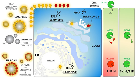 Schematic representation of the cellular compartments and where Proprotein Convertases are active against viral substrates. Furin processes the coronavirus SARS-CoV-2 spike S in the TGN; SKI-1/S1P matures the arenavirus LASV and LCMV GP-Cs in the ER and late Golgi, respectively. The cleaved viral glycoproteins reach the cell surface. Arenaviruses do incorporate only cleaved GP-C into viral budding particles since treatment with the SKI-1/S1P inhibitor PF-429242 blocks GP-C processing and its incorporation into budding particles; SARS-CoV-2 can include both cleaved and uncleaved envelope glycoprotein spike S.
