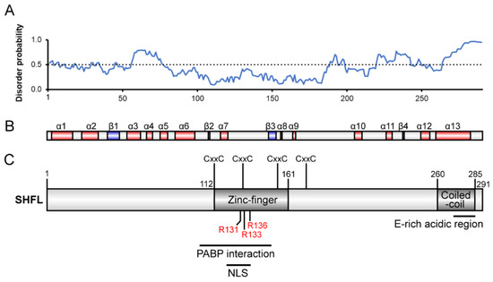 Predicted domains and features in SHFL. (A) Plot of predicted disorder probability vs. residue number (DISOPRED2 [60]), indicating a predominantly globular fold. (B) Prediction of secondary structural elements (PSIPRED [61]). (C) Annotated domain diagram of SHFL. The central CxxC motifs are highly conserved among family members (Pfam UPF0515). Other regions of interest include a putative zinc-finger domain, E-rich acidic domain, coiled-coil domain, nuclear localization sequence (NLS) and experimentally determined region necessary for interaction with PABP [47]. The locations of R131, R133 and R136 mutated in this study are indicated.