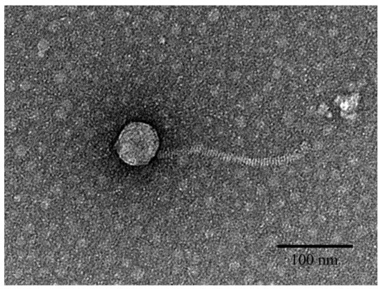 Phage propagation and purification were performed using the DLA assay in accordance with a previously described protocol with minor modifications [23]. The 18 h cultured top agar was collected using SM buffer (100 mM NaCl, 50 mM Tris (pH 7.5), and 10 mM MgSO4) and centrifuged to isolate phages from the agar matrix, after which it was filtered through a 0.45 μm membrane filter. Precipitation using ammonium sulfate was performed for the purification of phages. The phage lysate was mixed with 2% (v/v) Tween-80, and 35% (w/v) ammonium sulfate, and was incubated for 15 min at 4 °C. The pellicle was resuspended in SM buffer and purified using CsCl gradient ultracentrifugation [23]. The high titer of phage suspension (>1010 plaque-forming units (PFUs)/mL) dialyzed using 7000 MWCO membrane was stored at 4 °C.