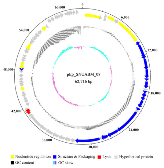 pEp_SNUABM_08 harbors a 62,715 bp dsDNA genome (GC content, 57.24%). Seventy-nine ORFs were detected in the genome; however, tRNA genes were not detected. Among the predicted ORFs, 48 were located on the positive strand and 31 were located on the negative strand (Figure 3). The predicted ORFs were categorized into the following four groups based on their function: nucleotide regulation (e.g., Cas4-like protein, putative exonuclease), structure and packaging (e.g., putative tail fiber protein, terminase small/large subunit), lysis (e.g., lysis protein A like protein, Rz like protein), and hypothetical proteins. The majority of the ORFs were found to be for hypothetical proteins (57 ORFs; 72.15%); lysogeny-, antibiotic-resistance-, and bacterial-virulence-related genes were not detected (Table S1).
