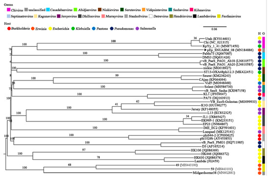 ). The genera (Chivirus, magenta; unclassified, mosaic; Casadabanvirus, cyan; Abidjanvirus, light green; Nickievirus, brown; Serutavirus, dark green; Vidquintavirus, orange; Sashavirus, turquoise; Kilunavirus, crimson; Septimavirus, sky blue; Kagunavirus, bisque; Jersyevirus, violet; Dhillonvirus, kakhi; Murrayvirus, petal; Stanboltvirus, gray; Detrevirus, white; Hendrixvirus, chartreuse; Lambdavirus, black; Feofaniavirus, chrome yellow) and host (Burkholderia, red; Erwinia, orange; Escherichia, yellow; Klebsiella, green; Pantoea, blue; Pseudomonas, dark blue; Salmonella, purple) are indicated using respective colors.