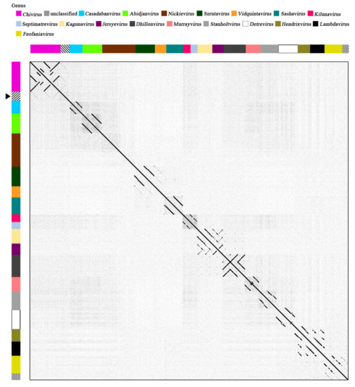 The predicted genes showed best matches with those of phages classified under the genus Chivirus with a relatively low identity (23–76%). The genome organization of pEp_SNUABM_08 was slightly similar to that of the well-known lytic bacteriophage Chi; however, a strong homology could not be observed for the last section of the genome (~37 kb; Figure S2). As expected, the complete nucleotide sequence of pEp_SNUABM_08 did not form a cluster with phages of the family Siphoviridae, which infect bacterial strains of class Gammaproteobacteria (Burkholderia, Erwinia, Escherichia, Klebsiella, Pantoea, Pseudomonas, and Salmonella), as shown in the phylogenetic tree (Figure 4), and did not exhibit the generation of a strong line in the dot plot analysis (Figure 5).
