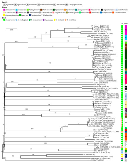 - Thompson, D.W.; Casjens, S.R.; Sharma, R.; Grose, J.H. Genomic comparison of 60 completely sequenced bacteriophages that infect Erwinia and/or Pantoea bacteria. Virology 2019, 535, 59–73. [Google Scholar] [CrossRef]