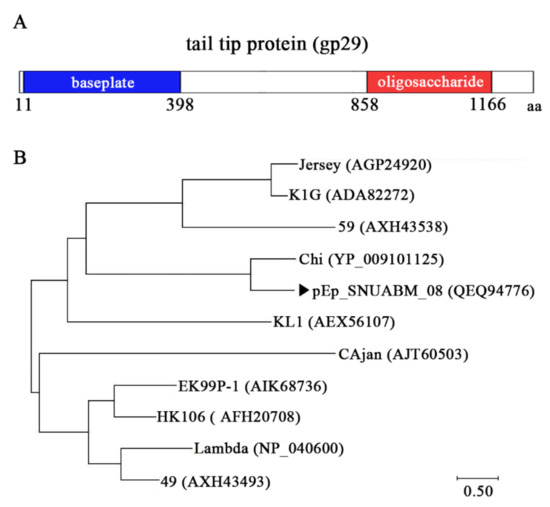 Schematic representation of the tail tip protein (gp29) of pEp_SNUABM_08 (A). The N-terminal (baseplate binding domain), and C-terminal (oligosaccharide binding domain) are colored in blue and red, respectively. Phylogeny analysis of the tail tip protein of pEp_SNUABM_08 (