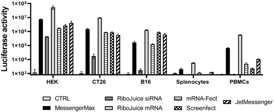Human embryonic kidney (HEK) 293 cells, murine colon carcinoma CT26 cells, and murine melanoma B16-F10 cells were maintained in RPMI medium (ThermoFisher Scientific, Waltham, MA, USA) containing 10% fetal calf serum (FCS), 200 mM l glutamine (Gibco, Waltham, MA, USA), and 0.2% antimicrobial reagent Normocin (InvivoGen San Diego, CA, USA), named complete medium in the following. The following mRNA lipofection agents were used: Lipofectamine Messenger Max (Invitrogen, Waltham, MA, USA), RiboJuice mRNA transfection kit and RiboJuice siRNA transfection kit (Merck Millipore Sigma Aldrich St. Louis, MO, USA), mRNA-Fect (RJH Biosciences Edmonton, AB, Canada), Screenfect (ScreenFect Transfections, Eggenstein-Leopoldshafen, Germany), and JetMessenger (Polyplus Transfection, Illkirch-Graffenstaden, France). For luciferase experiments, transfection of the above-mentioned cell lines was performed with 100,000 cells per well in 200 microliters of complete medium. mRNA carriers were prepared according to manufacturer protocols and added to plated cells to obtain a final mRNA concentration of 1 µg/mL, and incubated with cells for the indicated time. Luciferase activity was recorded one day after transfection by adding 25 microlitres of Bright-Glo luciferase assay solution (Promega, Madison, WI, USA) and measuring the activity using the GloMax Discover and Explorer Detection System equipment (Promega, Madison, WI, USA).