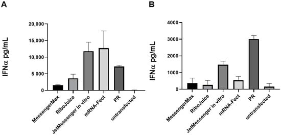 All the nanoparticles containing non-modified mRNA are immunostimulatory in vitro and induce IFNα release in murine and human immune cells (Figure 2A,B). In human cells, MessengerMax prompted the lowest production of IFNα, while mRNA-Fect and JetMessenger induced the highest. In murine splenocytes, RiboJuice and MessengerMax induced the lowest stimulation, whereas JetMessenger again induced the highest signal. This was interesting as both RiboJuice and MessengerMax induced the highest luciferase activity in human PBMCs and murine splenocytes (Figure 1), but this did not correlate with the highest innate immune response in these cells. This could be due to the different mechanisms of entry that the formulations illicit, i.e., the polyplex, JetMessenger, mediates cell entry via endocytosis, which could trigger the endosomal TLRs, leading to a greater IFNα response. Indeed, we also used protamine/RNA complexes as a positive control, where the cationic protamine forms nanoparticles with negatively charged RNA. These nanoparticles enter the cells via endosomes and induce elevated levels of IFNα (Figure 2A,B). IFNα stimulation is an important factor in the context of immunomonitoring in vitro, as a strong IFNα response can limit T-cell proliferation [21]; therefore, it may be preferred to prevent the induction of a strong IFNα response in cell cultures.