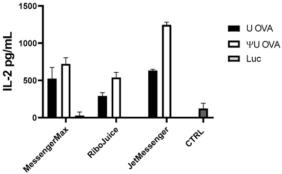 To test whether particle-based mRNA transfection in immune cells induces detectable adaptive immune responses, we monitored the secretion of interleukin-2 (IL-2) in splenocytes cultured from OT1 mice. OT1 T cells express the transgenic T-cell receptor that recognizes ovalbumin (OVA) peptide. T cells are stimulated when they recognize the OVA peptide SIINFEKL (residues 257–264) presented on the MHC class I molecule, H-2 Kb [23]. As RiboJuice mRNA, MessengerMax, and JetMessenger gave the highest luciferase expression in PBMCs, they were used to transfect splenocytes from OT1 with ivt mRNA-coding ovalbumin. We observed elevated IL-2 levels in cells transfected with all formulations containing ovalbumin-coding mRNA, while particles containing luciferase-coding mRNA did not induce any response in OT1 cells (Figure 3).