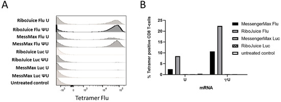 We also evaluated our lipofection-based immunomonitoring approach in an ex vivo human system. To that end, PBMCs from an HLA-A*0201 healthy donor were isolated and incubated with formulated mRNAs that encoded the influenza matrix protein M1 (Flu M1) or luciferase as a control. Formulations tested were RiboJuice mRNA and MessengerMax, which induced the greatest expression of luciferase in PBMCs and the lowest induction of IFNα (Figure 1 and Figure 2). IFNα levels were measured in supernatants from all treated groups 24 h post transfection. IFNα could be strongly induced only in groups cultured with immuno-stimulating ivt mRNA and not in groups cultured with immuno-silent mRNA (Figure S3).