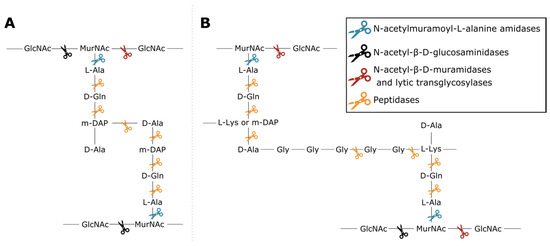 Cleavage sites of the different enzymatic classes of EADs on the primary structures of two common peptidoglycan types. (A) peptidoglycan chemotype A1γ is the most common in Gram-negative bacteria; (B) peptidoglycan chemotype A3, either α or γ depending on the presence of L-Lys or mDAP in the third position of the peptide subunit, is a type example for Gram-positive bacteria such as Staphylococcus aureus [10]. The colored scissors indicate cleavage sites of different classes of EADs. GlcNAc and MurNAc in the glycan strands of each structure refer to N-acetylglucosamine and N-acetylmuramic acid, respectively.