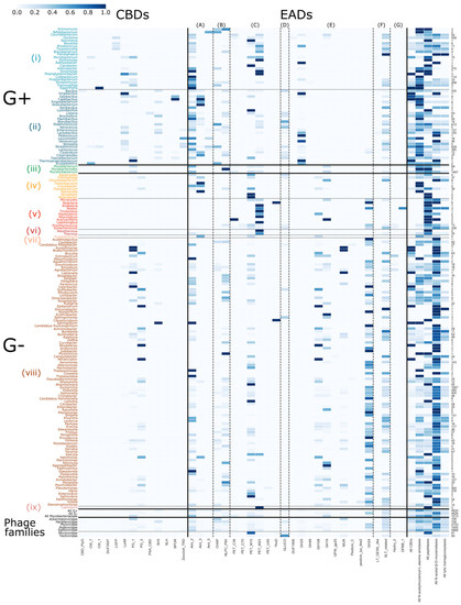 Distribution of EADs and CBDs across bacterial genera. The color bar on the right denotes the probability that a domain occurs in a phage lytic protein, given its bacterial host (dark blue = 1; white = 0). The examined host phyla from top to bottom, separated by dashed and full lines, are: (i) Actinobacteria without Mycobacteriaceae (family), (ii) Firmicutes, (iii) Mycobacteriaceae (family), (iv) Bacteroidetes, (v) Cyanobacteria, (vi) Deinococcus-Thermus, (vii) Fusobacteria, (viii) Proteobacteria and (ix) Spirochaetes. The enzymatic domains from left to right, separated by dashed lines, are: (A) N-acetylmuramoyl-L-alanine amidases, (B) domains with mixed N-acetylmuramoyl-L-alanine amidases and peptidase activity, (C) peptidase domains, (D) N-acetyl-β-D-glucosaminidase domains, (E) N-acetyl-β-D-muramidase domains, (F) domains with N-acetyl-β-D-muramidase and lytic transglycosylase activity and (G) lytic transglycosylase domains. On the bottom, probabilities are grouped given the host Gram-types as well as the phage families and on the right, the overall probability of domains of a given activity are set out for each bacterial host. The column of the right shows the number of proteins in PhaLP that target each host genus. Due to the sparsity in occurrence of the miscellaneous domains, only CBDs and EADs were examined in this figure. Figures S2–S4 illustrate the inverse relation, and the distributions including miscellaneous domains, respectively. Due to their size, these figures are best viewed digitally.