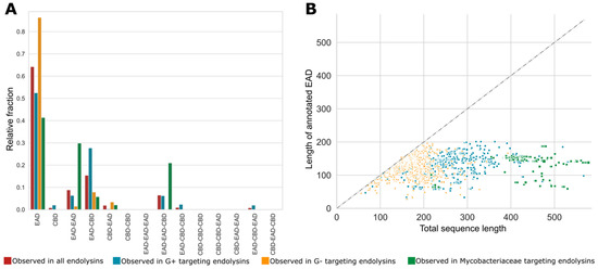 Relative fractions of specific single, bi- and tri-modular architectures for endolysins with different host specificities and the putative presence of unannotated domains. (A) The relative occurrence of each of the theoretically possible single, bi- and trimodular architecture comprising EADs and CBDs is set out for all unique endolysin sequences (red) and split up for endolysins from phages infecting Gram-positive bacteria (blue), Gram-negative bacteria (yellow) and Mycobacteriaceae (green). These fractions sum to one for each group of hosts; (B) the length of the annotated domain versus the total sequence length of EAD-only architectures. To accommodate for the variable numbers of repeats of a single CBD, they were condensed into a single occurrence of the domain. This analysis shows that mainly endolysins targeting Gram-positive and Mycobacteriaceae hosts comprise unannotated domains.