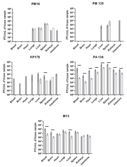 Tissue distribution of phages PM16, PM135, KP179, PA136, or M13 estimated based on their titers. Mice (n = 12 in each group) were once administered an intraperitoneal injection of a selected phage at a target dose of 108 PFU per mouse in 100 μL 0.9% NaCl. Blood and tissue samples were taken from six mice from each group six hours after phage injection (grey columns) and 24 h after injection (white columns). Phage titers were determined using a fresh layer of an appropriate bacterial host strain in the top agar. Results are given in mean values ± standard deviation. Horizontal lines indicate statistical significance, p < 0.05.