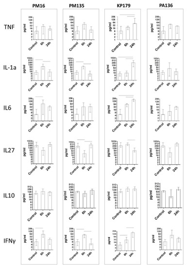 The PM16 phage induced a remarkable increase in IL-1, IFNg, and IL-6 levels at six hours after phage administration, followed by their decrease at 24 h (Figure 3), whereas IL-27, in contrast, showed a more than two-fold decrease in its median level at six hours and increased its initial level at 24 h after phage introduction. IL-10 showed a less prominent elevation. The PM135 phage demonstrated a similar pattern for the same set of cytokines, showing only minor differences in the cytokine levels. PA136 injection was accompanied by similar patterns for IL-1, IFNg, IL-6, and IL-27, but not for IL-10, which was downregulated at 6 h after phage administration with subsequent normalization at 24 h (Figure 3).