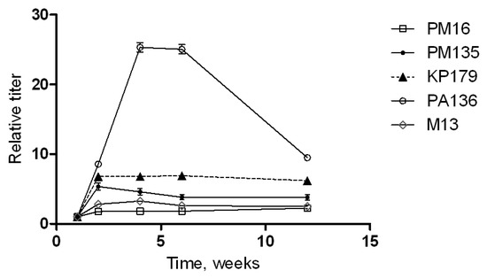 Phage-specific indirect ELISA of sera of immunized mice. Serum samples were obtained before immunization and 1, 2, 4, 6, and 12 weeks after the last immunization of mice injected three times with a selected phage (PM16, PM135, KP179, PA136, or M13) without any adjuvants. Antibody titers were calculated based on the crossing of dilution curves with the baseline. Results are given as relative antibody titers, calculated as a ratio of different time point titers to the initial titer (before immunization) of antibodies against the corresponding phage.