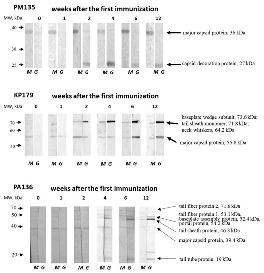Western blot analysis of phage lysates fractioned using 12% SDS-PAGE and transferred onto a nitrocellulose membrane (Bio-Rad, USA). Phage proteins were revealed by anti-phage IgM (M) and IgG (G) antibodies from pooled serum samples obtained before immunization and 1, 2, 4, 6, and 12 weeks after the first immunization of mice injected three times with a selected phage (PM135, KP179, or PA136) without any adjuvants. The left arrows correspond to molecular weights of protein standards (Thermo Fisher Scientific, USA). The names and molecular weights of the identified proteins are indicated on the right.