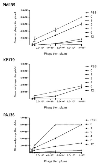 No changes in phage infectivity were detected for anti-PM16 mouse serum samples. However, when lytic activities of phages PM135, KP179, or PA136 treated with serum collected after immunization were compared with those for the phages mixed with sera obtained before immunization, a substantial decrease in phage lytic activities was found (Figure 6). For PM135 and PA136, immune sera collected 4, 6, and 12 weeks after the first immunization eliminated lytic activities of the corresponding phages. Moreover, phage infectivity of KP179 was fully inhibited by sera derived starting from the first week after immunization. The obtained results indicated that antibodies elicited by PM135, KP179, or PA136 phages can neutralize infectivity of these phages. Notably, serum samples collected before administration of PM135 or KP179 exhibited the ability to reduce phage infectivity compared to PBS (Figure 6). This result corresponds well with the identification of pre-existing IgM in serum samples from mice before immunization.
