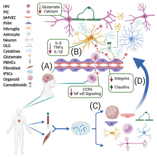 Over the past decade, there have been considerable advances in the use of human indued pluripotent stem cells (hiPSC) to model specific CNS cell types and neuronal subtypes [208]. Transcription factors or small molecules differentiate these human cells into a state morphologically, transcriptionally, and functionally similar to their primary counterparts, including neurons, astrocytes, microglia, macrophages, and endothelial cells [209]. Recently, our lab published data demonstrating a forebrain hiPSC triculture system with neurons, astrocytes, and microglia [9]. This method rapidly produces microglia-like cells (iMg) that express multiple classical markers that can be productively infected with HIV and respond to ART. While this system is a first step in the generation of multicellular CNS cultures, three-dimensional (3D) models that incorporate brain macrostructures and replicate the blood–brain barrier will incorporate several advantages of in vivo models and allow for examination of the effects of peripherally administered HIV, cannabinoids, and ART on the brain. To this end, integrating iMgs into existing 3D forebrain organoid models [210,211,212] offers an opportunity to observe infected human microglia in spatial context with neurons, other glia, and larger brain structures. Further co-culture or organoid designs that use 3D-printed vasculature, microfluidic devices, or permeable supports alongside human BMEC cells offer the potential to overcome one of the most significant limitations of in vitro modeling: the lack of a functional BBB [213,214,215]. Unfortunately, current in vitro models cannot replicate oligodendrocytes with functional myelination, which restricts our understanding of HIV and ART white matter pathologies. While differentiating and maintaining iPSC models can be expensive and time consuming, increased differentiation efficiency and more rapid differentiation offer the possibility of high-throughput iPSC modeling, which is necessary and, excitingly, sufficient to delineate the complex three-way cross talk between HIV, cannabinoids, and ART that is present in many people living with HIV and associated neuropathology.