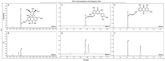 HPLC chromatography chromatogram of Ae. Detection at wave length 355 nm for Aloin from reference standard or Ae (A,B). Detection at wave length 360 nm for Quercetin from reference standard or Ae (C,D). Detection at wave length 254 nm for Emodin from reference standard or Ae (E,F).