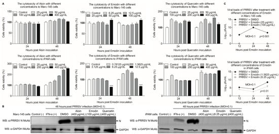 The Cell Counting Kit-8 (CCK-8) (Yeasen Biotech, Shanghai, China) was used to examine the cytotoxicity of drugs on Marc-145 and iPAM cells. Briefly, Aloin, Emodin and Quercetin were dissolved with dimethylsulfoxide (DMSO) at concentrations of 400 μg/mL, 100 μg/mL and 400 μg/mL, respectively. 100% confluent cells in 96-well plates were incubated with the control normal maintenance medium or the maintenance medium containing 0.1% DMSO or various concentrations of drugs (Ae, Aloin, Emodin and Quercetin) for 24 h and 48 h. Then, 100 μL maintenance medium containing 10% CCK-8 reagent was added to each well, and the cells were incubated at 37 °C for another 1 h before the CCK-8 signal was measured at an absorbance of OD450 nm. The relative viability of the cells was analyzed according to “cell survival rate (%) = [OD (sample) − OD (blank)/OD (control) − OD (blank)] × 100%”.