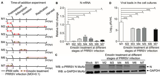 Effect of Emodin treatment on the replication stages of PRRSV. (A) iPAMs infected PRRSV were treated with Emodin (6.25 μg/mL) or 0.1% DMSO at different stages (M1-M7) of infection. Cells were harvested at 24 hpi, then the viral yields were titrated by (B) real-time PCR using specific primers, (C) Western Blot using anti-PRRSV N monoclonal antibody and anti-GAPDH monoclonal antibody and (D) TCID50 assay. The results are representative of three independent experiments (mean ± SD). n = 3. * p < 0.05, ** p < 0.01, *** p < 0.001.