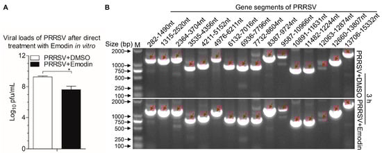 To investigate whether Emodin can directly inactivate PRRSV viral particles, live PRRSV were treated with Emodin or 0.1% DMSO at 37 °C for 3 h. Subsequently, the infectivity of the treated viruses was detected by TCID50 assay. As shown in Figure 5A, exposure of PRRSV to Emodin exhibited virucidal effect (p < 0.05), indicating Emodin can kill PRRSV directly. To verify whether Emodin destroys the viral genome, RT-PCR was performed, and the results revealed that Emodin at the indicated concentration of 6.25 μg/mL did not degrade the viral genome, as compared to the controls (Figure 5B).
