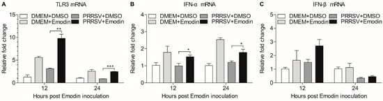 TLR3 activation decreases PRRSV infection [44], which prompted us to examine the effect of Emodin on TLR3 after PRRSV infection. We found that Emodin could increase the mRNA expression of TLR3 (p < 0.01) in iPAMs after PRRSV infection at 12 hpi and 24 hpi, as compared to that of control (Figure 6A). It was reported that type I interferons (IFN-α/β) could be induced after TLR3 activation [45]. We further examined the mRNA expression of IFN-α and IFN-β in Emodin-treated iPAMs after PRRSV infection at 12 hpi and 24 hpi. As shown in Figure 6B,C, we found that Emodin was able to increase the mRNA of expression of IFN-α (p < 0.05) and IFN-β in iPAMs after PRRSV infection, indicating that Emodin stimulation of TLR3 activation-induced IFN-α might contribute to its anti-PRRSV activity.