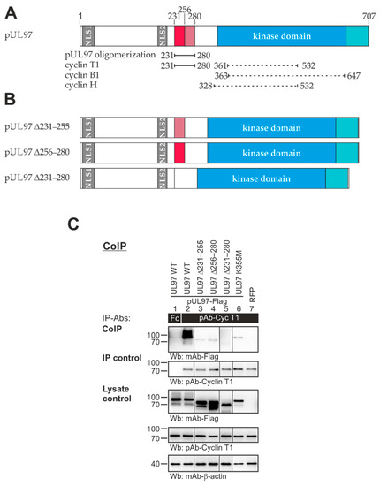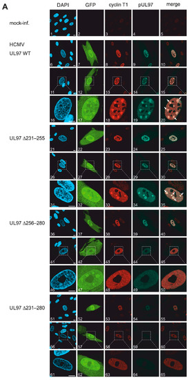 Human cytomegalovirus (HCMV) is a worldwide distributed opportunistic pathogen of the β-Herpesvirinae subfamily that establishes lifelong latent infection in humans. In the immunocompetent host, HCMV may remain asymptomatic, whereas in immunosuppressed individuals, such as transplant recipients, tumor and AIDS patients, HCMV infection can lead to severe symptoms and a life-threatening viral pathogenesis [1,2]. Most seriously, congenital HCMV infection represents a considerable risk for the unborn child to obtain developmental defects or cytomegalovirus inclusion disease [3,4]. Viral pathogenesis is closely linked to the efficiency of viral replication in individual tissues, whereby the pathogenic determinants based on virus–host interaction are insufficiently understood. On the molecular level, recent investigations stressed the importance of multiprotein complexes consisting of viral and host components [5,6,7,8,9]. Notably, HCMV replication drastically interferes with cell cycle regulation, a process in which the HCMV-encoded protein kinase pUL97 massively phosphorylates the checkpoint regulator retinoblastoma protein (Rb) [10,11,12]. This initial Rb inactivation, followed by further viral regulatory steps of intervention, ultimately results in an early S phase cell cycle arrest accompanied by the massive dysregulation of cyclin-dependent kinases (CDKs) and cyclins termed pseudomitosis [1,13,14,15]. Interestingly, HCMV encodes the serine-threonine protein kinase pUL97 that represents a viral CDK ortholog (vCDK) as it combines typical structural and functional features of host CDKs [16]. Expressed with early–late kinetics, pUL97 is primarily a nuclear kinase, possessing a variety of phosphorylation activities including autophosphorylation, is later transported to cytoplasmic viral replication compartments (cVACs) and ultimately packaged into virions as a tegument protein. In addition to autophosphorylation, pUL97 mediates the phosphorylation of other viral tegument proteins, such as pp65/pUL83 and pUL69 [17,18,19,20,21]. A pronounced complexity of pUL97 protein interactions and substrate phosphorylation has been described [16], as illustrated by the number of viral and cellular target proteins identified so far [22,23,24]. The functionality of these substrates spans various regulatory aspects of viral replication, such as nuclear egress, intrinsic immunity, genome replication and gene expression [16,25,26]. Previously, we identified a specific feature of pUL97, in that it associates with human cyclins of the three types T1, H and B1 [9,27,28,29,30]. These three cyclins obviously possess different affinities in pUL97 binding [29] and might also play different functional roles [9]. Based on these observations, pUL97 is considered a multiple cyclin-binding kinase, and, in addition to the types T1, B1 and H, further cyclin binding activities, e.g., cyclin A, might also play another interesting role [16,28,31].