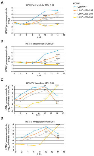 HCMV replication kinetics of the UL97 deletion mutants. HFFs were infected with parental HCMV WT or UL97 mutants at MOI of 0.01 (A,C), or 0.001 (B,D). Viral supernatants were harvested at indicated time points and viral genome equivalents were determined by qPCR (A,B). Alternatively, cells were harvested at indicated time points and intracellular viral genome equivalents were determined together with albumin as housekeeping gene via qPCR. Subsequently, HCMV genome equivalents were normalized to albumin signals (C,D). Each value is given as a mean of quadruplicates and standard errors of mean (SEM) are shown. Statistical analysis was performed using ordinary one-way ANOVA and Dunnett’s test compared to HCMV UL97 WT. ****, p < 0.0001; ***, p < 0.001; **, p < 0.01; n.s., not significant.